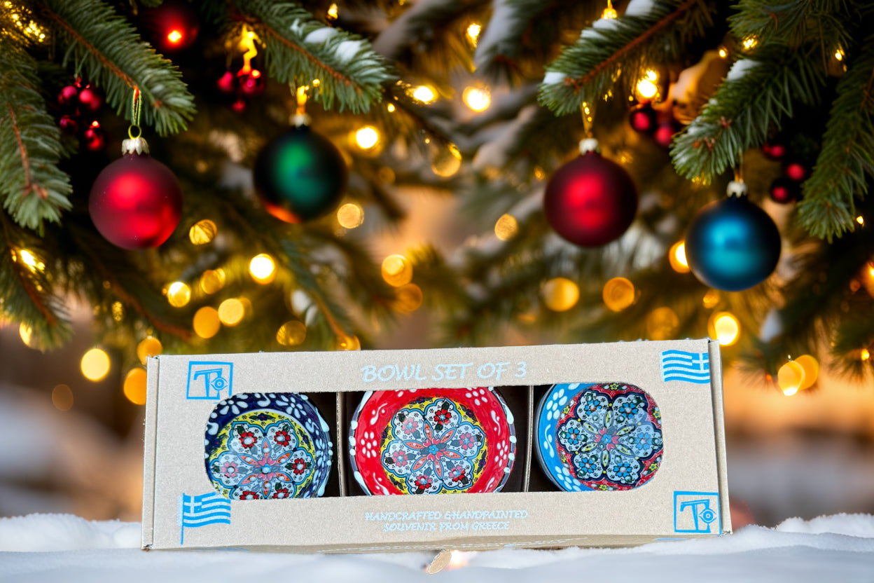 Handgemaakte en handbeschilderde keramische schaaltjes van het Griekse eiland Rhodos. Elk setje bestaat uit drie schaaltjes in levendige kleuren met traditionele, structurele patronen. Door het handwerk is elk item uniek - geen enkele set is exact hetzelfde.