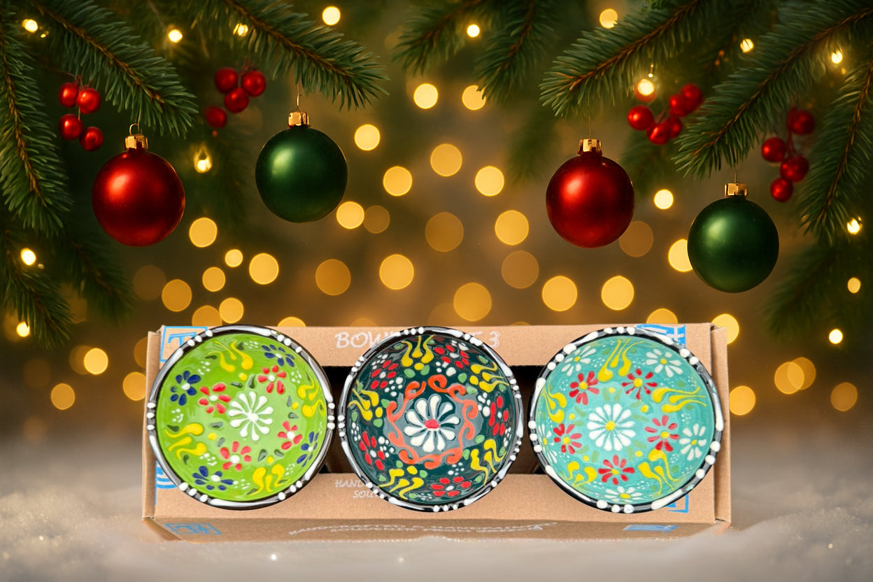 Handgemaakte en handbeschilderde keramische schaaltjes van het Griekse eiland Rhodos. Elk setje bestaat uit drie schaaltjes in levendige kleuren met traditionele, structurele patronen. Door het handwerk is elk item uniek - geen enkele set is exact hetzelfde.