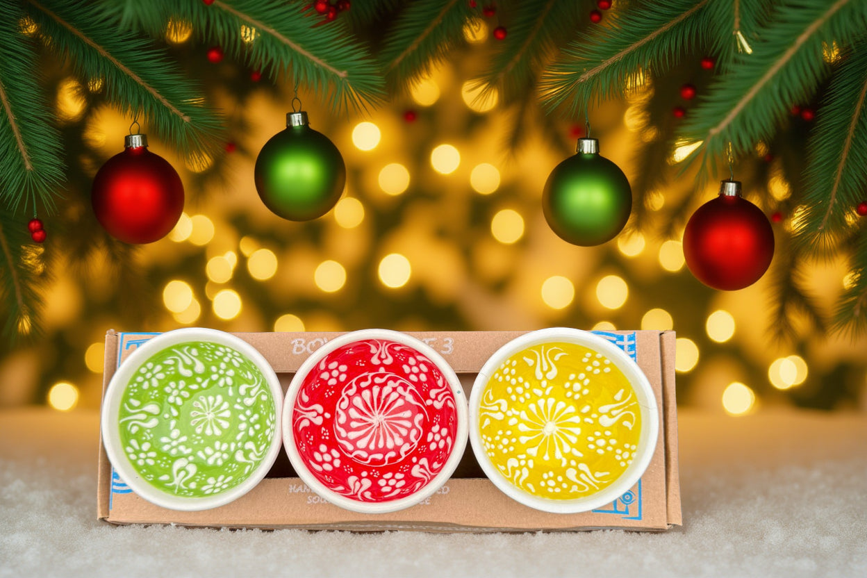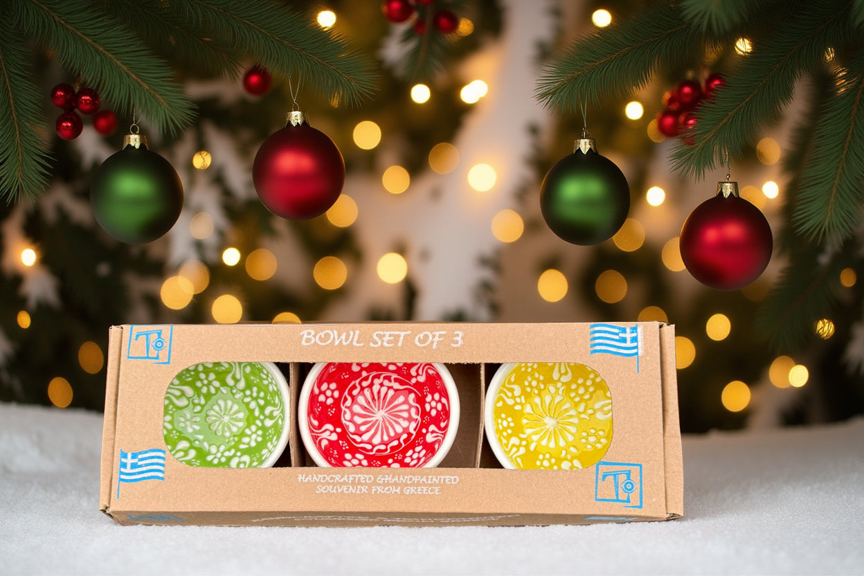 Handgemaakte en handbeschilderde keramieken schaaltjes van het Griekse eiland Rhodos. Elk setje bestaat uit drie schaaltjes in levendige kleuren met traditionele, ambachtelijke patronen. Door het handwerk is elk item uniek — geen set is exact hetzelfde.